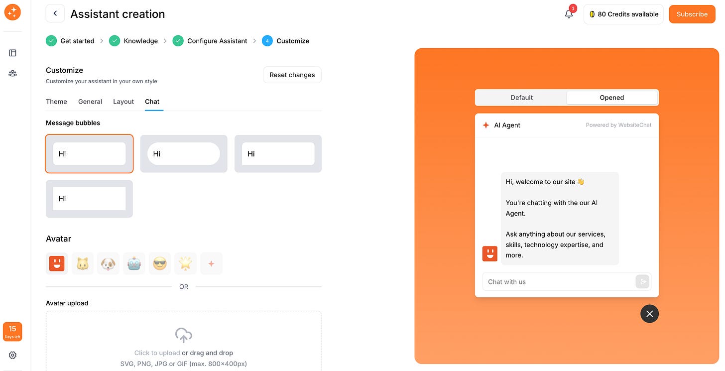 All these customization options allow you to design the chatbot interface to seamlessly blend into your site’s design. Spend a few minutes in this section of the builder tweaking the settings. It’s usually an instant preview – as you change the layout or text, you’ll see the preview of the widget update. Aim to make the chatbot window look like it “belongs” on your site.