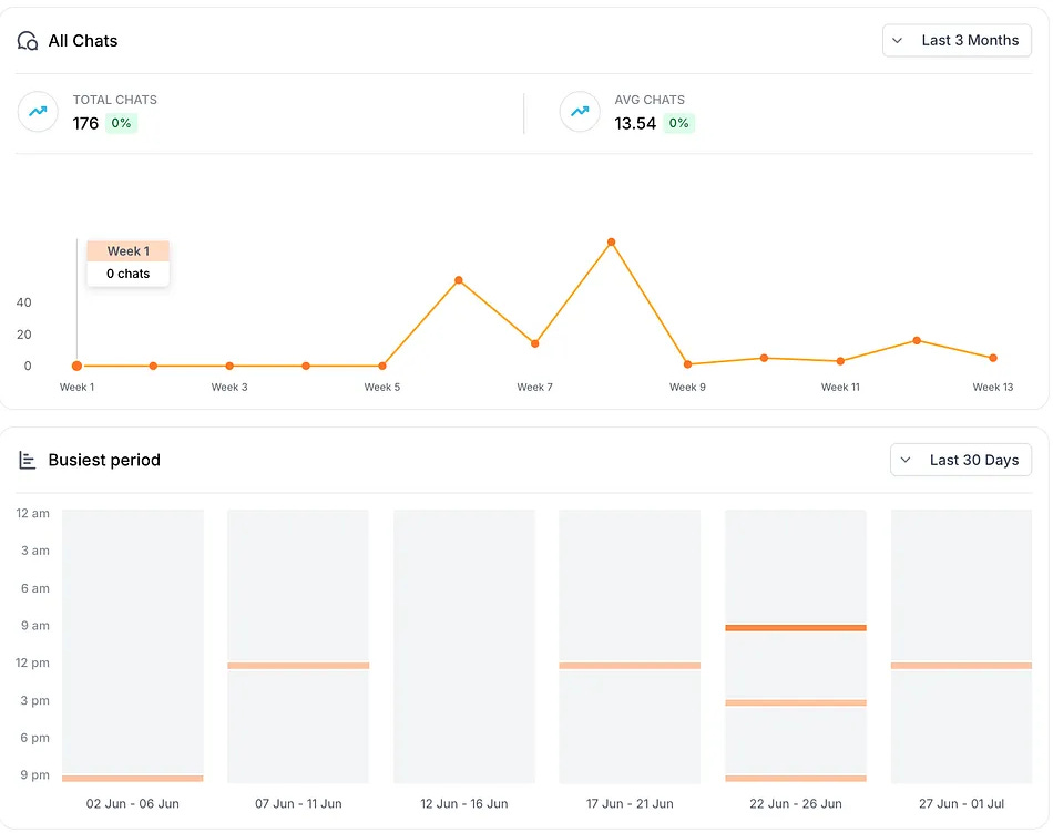 Number of Chats: Check how many chats your bot is handling per day or per week. This shows you the volume of engagement. If you suddenly see a spike in chats on a particular day, that might correspond with a marketing campaign or a seasonal traffic boost. For instance, you might discover that on Mondays you get double the chats compared to other days – perhaps because people have questions after using your product over the weekend.