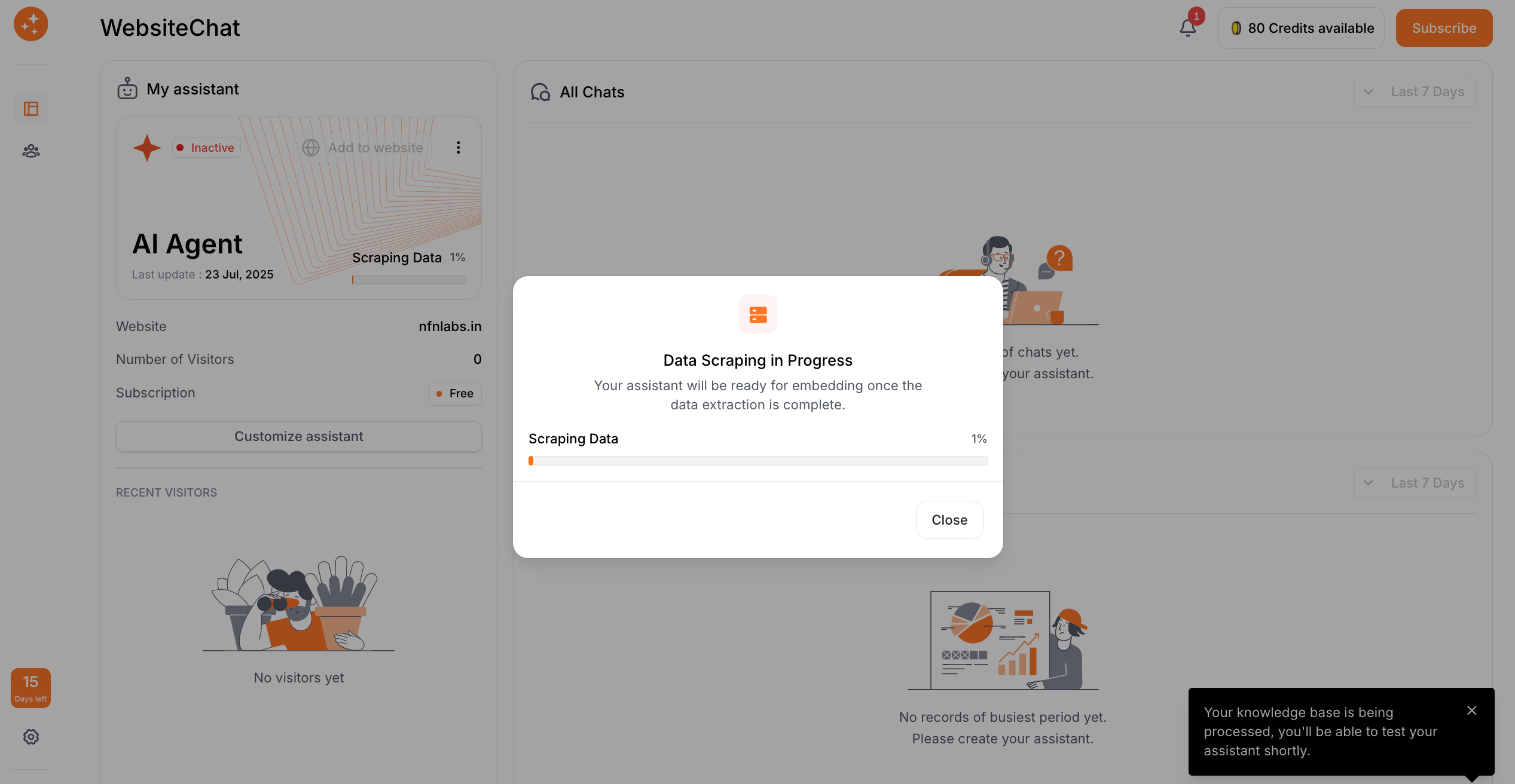 This step is a bit of a waiting game, but an important one – the knowledge base creation. Depending on the size of your website or documents, the AI may still be busy getting trained. Here’s what to expect and how to handle it: