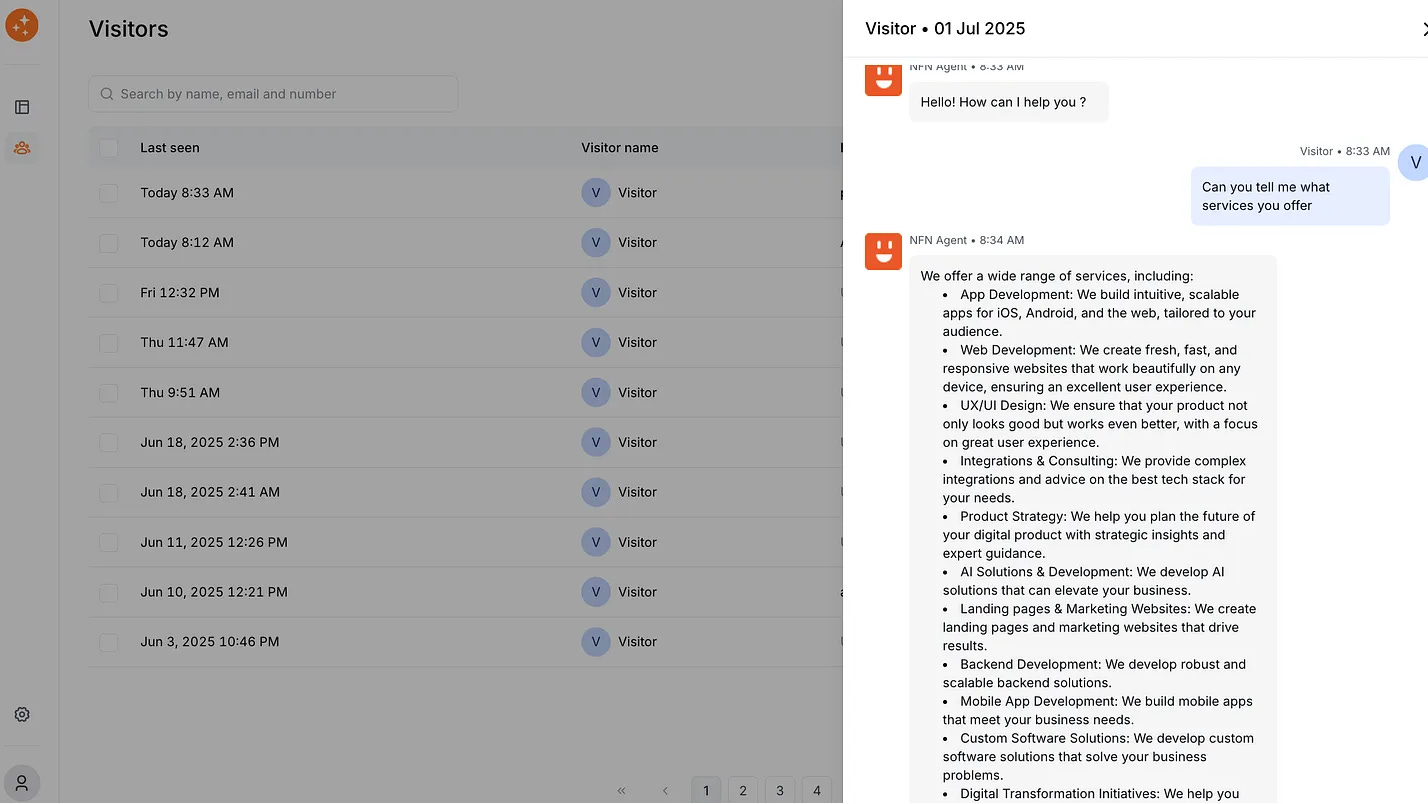 Once your AI chatbot is live, it will immediately start engaging with visitors — answering questions, collecting leads, and so on. To make sure it’s doing a good job (and to glean insights from it), you should regularly monitor its performance through the dashboard’s analytics or reporting features. WebsiteChat provides a dashboard of metrics and conversation logs that you can use to evaluate and improve your chatbot over time.