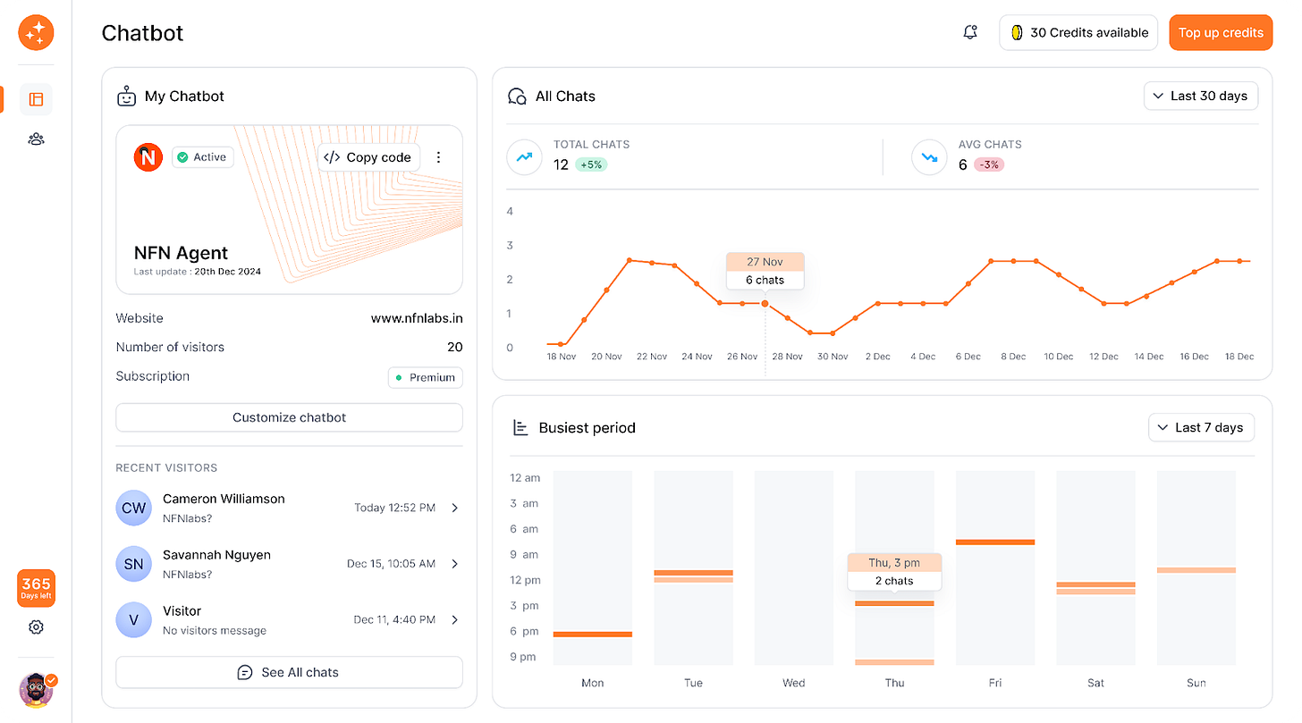 WebsiteChat isn’t just about chatting — it’s also about insights. The platform will offer analytics with graphs and trends so you can track how visitors interact with the widget. One particularly useful insight is identifying peak engagement times: in other words, when are people chatting with your support agent the most? The dashboard might show, for instance, that traffic and chats spike on weekdays around 3 PM, or maybe you get a lot of chat activity in the evenings.